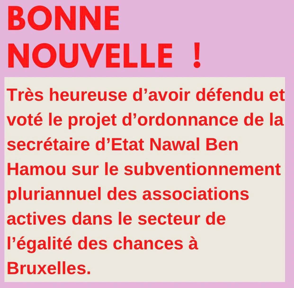 Pendant 5 ans, j’ai été active en commission Égalité des chances/droits des femmes, Allocations familiales et Aide à la personne/Santé au parlement bruxellois.